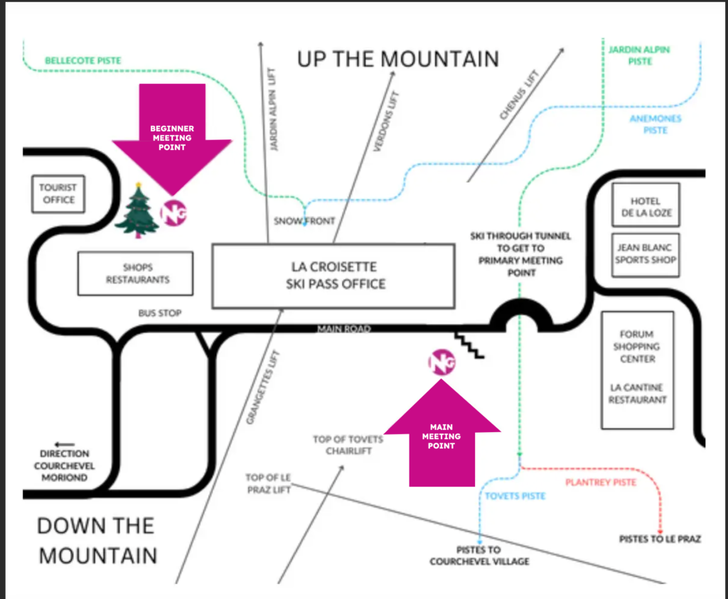 Directions: From the snow front at Courchevel 1850, ski under the bridge to your left of the lift building (the Croisette) towards the direction of Courchevel Village/1550/Le Praz. Turn immediately right when you come out of the tunnel. Click here for a video of how to ski to the main meet point.